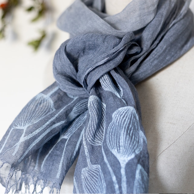 【作品について】 ブルーグレーの色合いが、自然光の下ではやわらかく、室内では落ち着いた表情を見せてくれる、リネンストール。中南米原産で、古くから「生命の木」や「聖なる木」として大切にされてきたログウッドの芯を用い、手仕事で染め上げたリネン100%のストールです。 植物の生命力が宿るログウッドは、染め方次第で紫から深いダークグレーまで、魔法のように表情を変える不思議な染料ですが、どの染め方でも洗練された都会的な色合いに染まります。本作品は両端に少し濃さを持たせた「ニュアンスぼかし染め」を施しており、巻いたときに生まれる美しい陰影が、この一枚ならではの豊かな表情を作り出します。 野の草をモチーフにした柄は、スクリーンプリントで丁寧に施しました。生地に自然に馴染むインクを使用しているため、リネンの軽やかな動きに合わせて軽やかに表情を変えます。 【日常に、特別な彩りを】 シャリ感がありながらも使うほどに肌に馴染むリネン素材は、季節を問わず重宝します。朝夕の肌寒さや冷房対策といった日常使いはもちろん、その希少性と手仕事の温もりから、大切な方への特別な贈り物としても自信を持っておすすめできる一品です。 【素材・サイズ】 素材:リネン100% サイズ:約45cmX180cm(ふさ9cm) 【お手入れについて】 草木染めの色合いを長く楽しんでいただくため、以下のケアをおすすめします。 ・中性洗剤を使用し、単独でやさしく手洗いしてください ・直射日光を避け、風通しの良い場所で陰干ししてください ・時間とともに色がなじみ、変化していく風合いも藍染ならではの魅力です 【ご購入前にご確認ください】 ・モニター環境により、実物と色味が異なって見える場合があります ・手染め・ハンドプリントのため、わずかな染め・プリントむらが見られることがあります ・撮影用の小物は付属しません ・着用イメージはAI技術を用いて生成されています。 【配送について】 送料無料でお届けします。