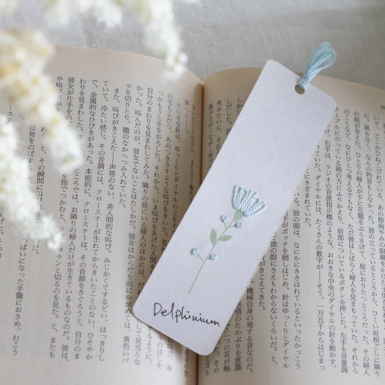ペーパーエンブロイダリー、紙に刺しゅうした手作りしおり、エレガントなデルフィニュームがモチーフ。