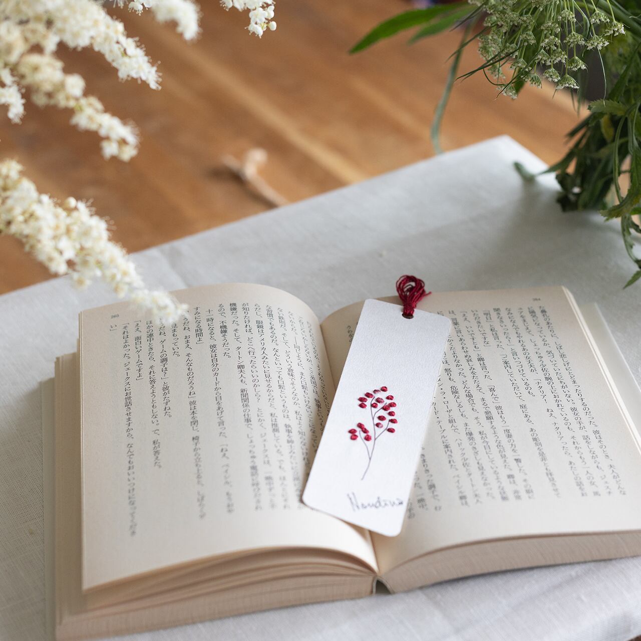*しおりは本の間に挟むため、意図的に刺しゅうの3D感を緩和しておりますこと、ご了承ください。