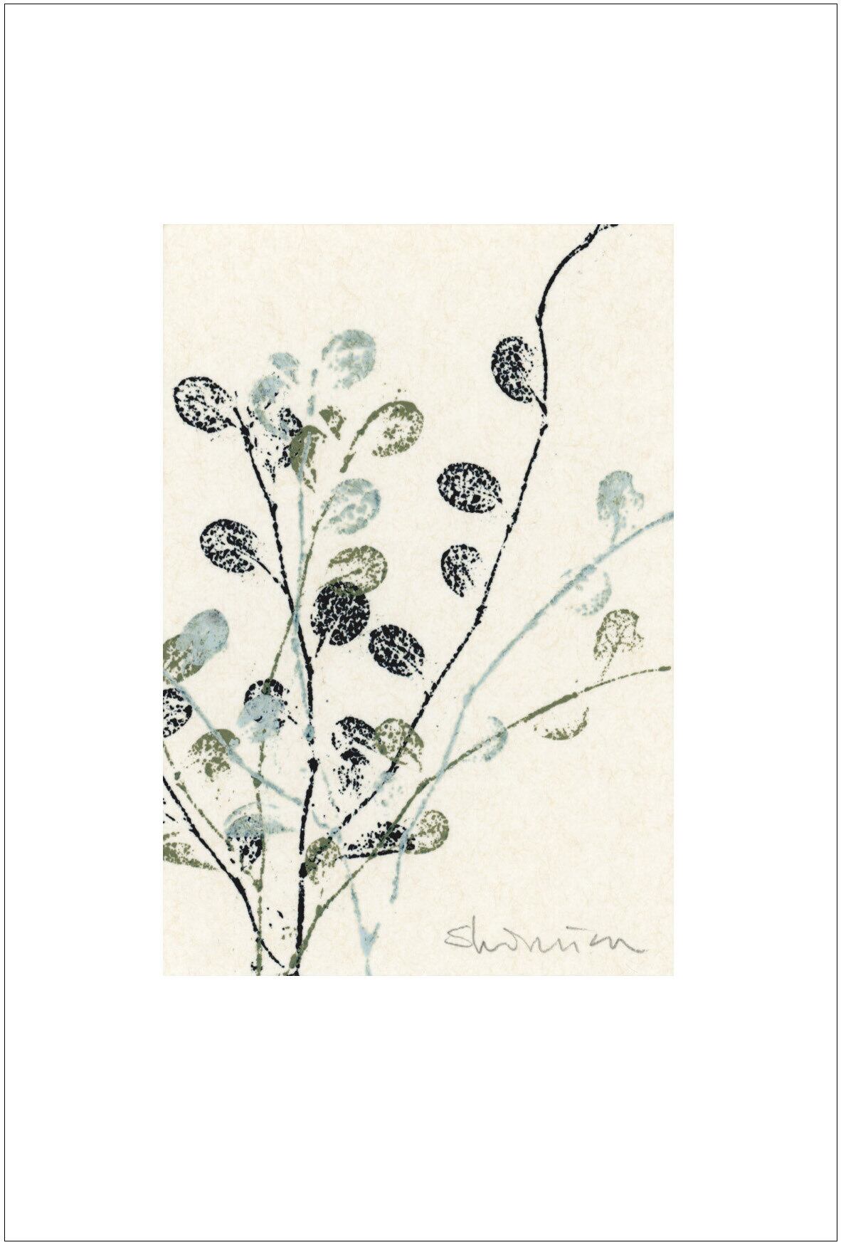 ホンモノの植物で刷ったボタニカルモノプリント(版画)の原画をデジタル化し、原寸のまま複製したポストカード。