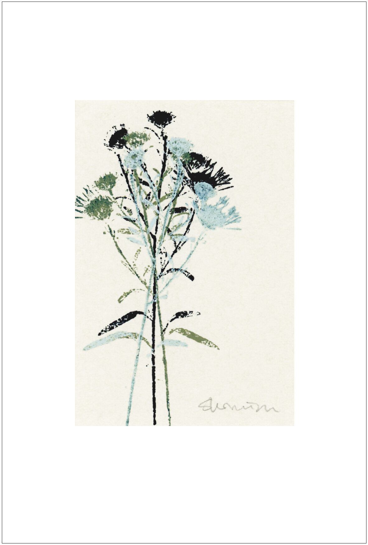 ホンモノの植物で刷ったボタニカルモノプリント(版画)の原画をデジタル化し、原寸のまま複製したポストカード。