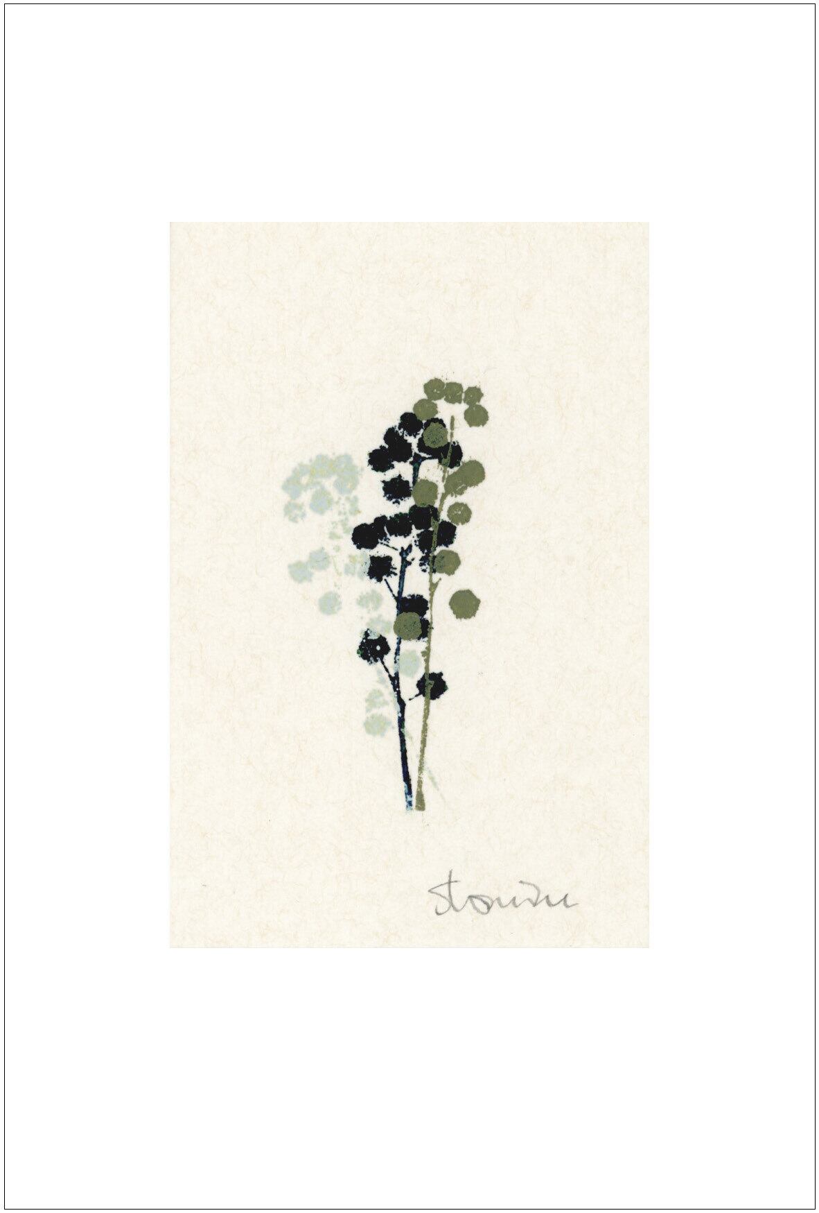 ホンモノの植物で刷ったボタニカルモノプリント(版画)の原画をデジタル化し、原寸のまま複製したポストカード。