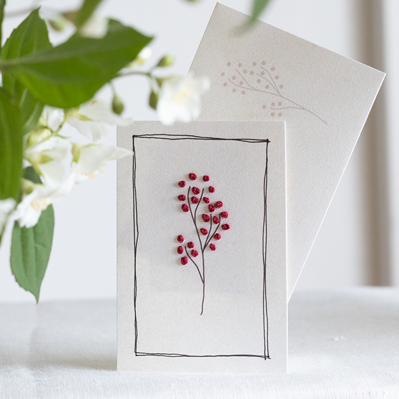 南天の実は古来より「幸福」や「反映」を象徴する植物です。そんな気持ちが込められた小さなカードは、大切な方への心温まる贈り物にひっそり添えるのに最適。シンプルでありながらエレガントなデザインは、シチュエーションを選びません。