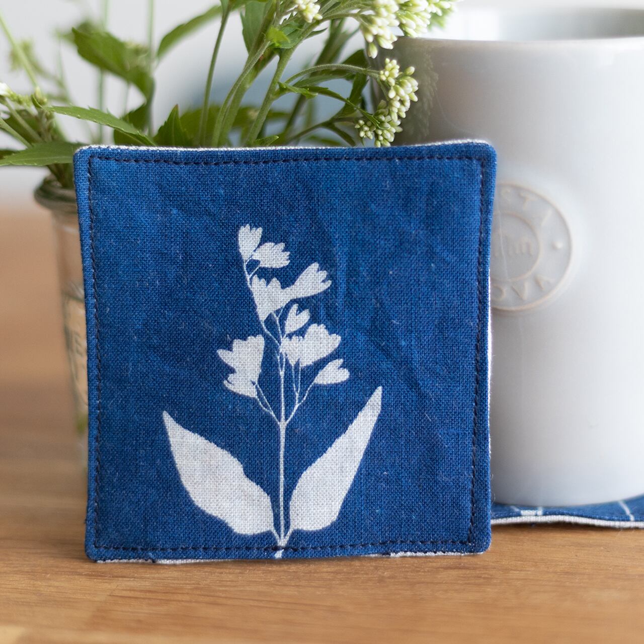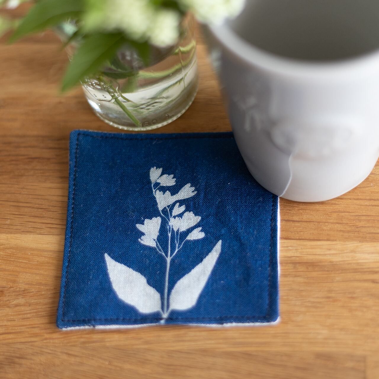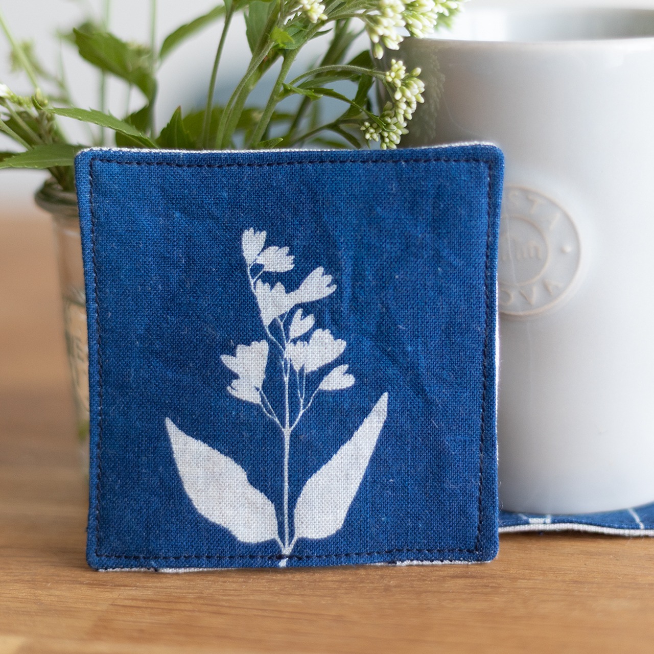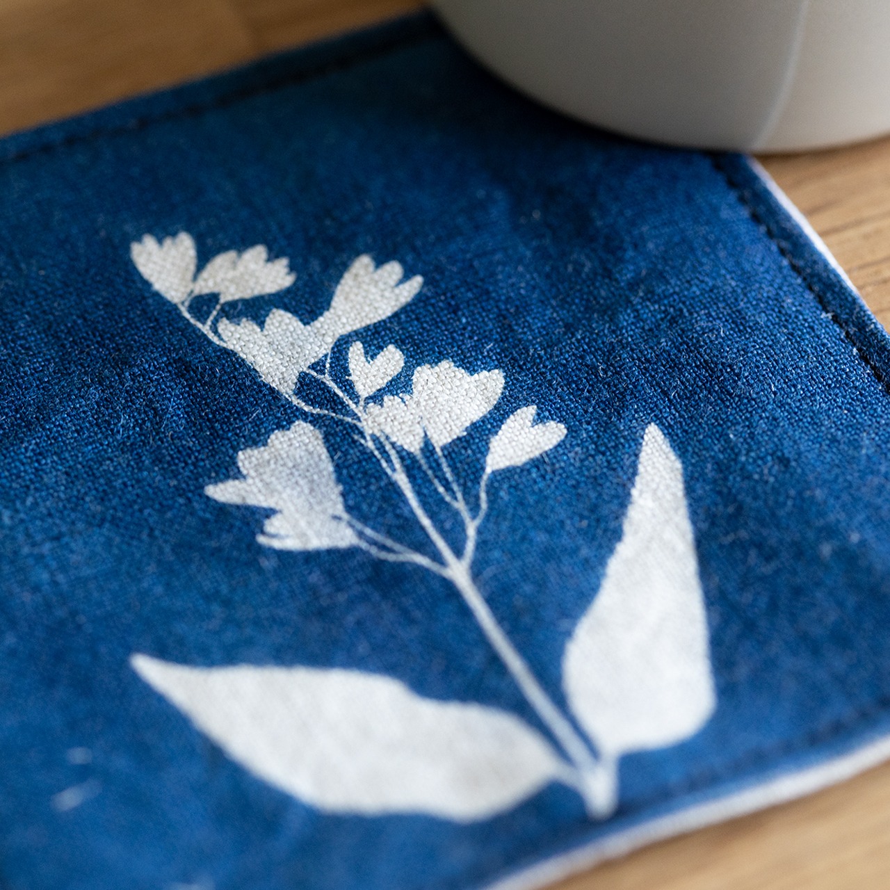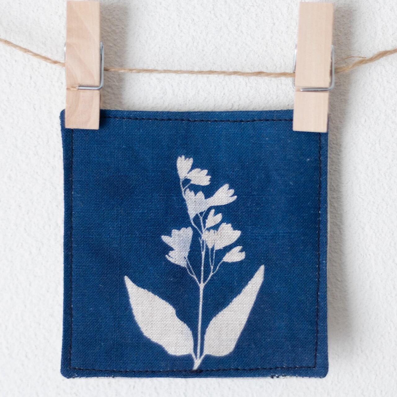SUNプリント(日光写真)を麻100%の布にプリントしています。サイアノタイプ(青写真)と呼ばれ、太陽光(UVライト)で感光する、19世紀に発明された古い写真の技法です。