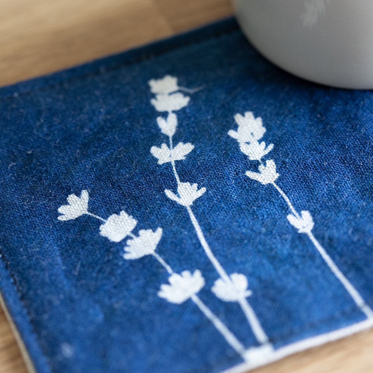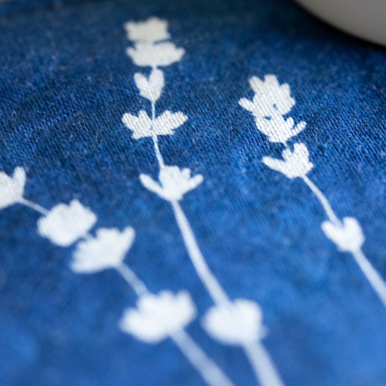 SUNプリント(日光写真)を麻100%の布にプリントしています。サイアノタイプ(青写真)と呼ばれ、太陽光(UVライト)で感光する、19世紀に発明された古い写真の技法です。