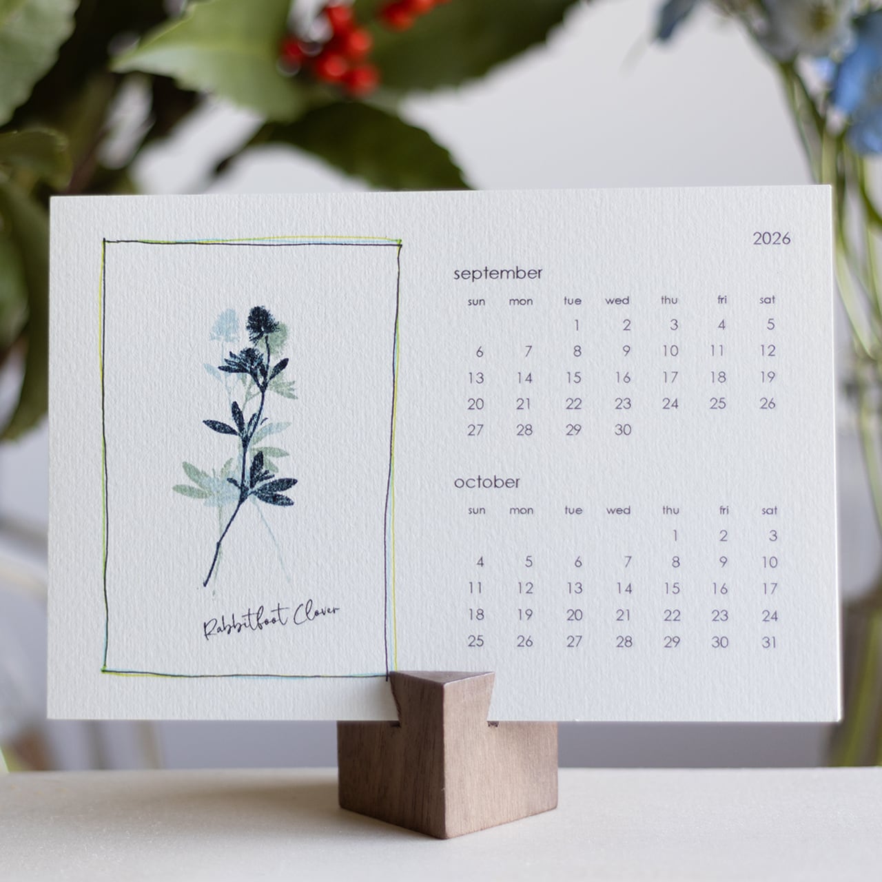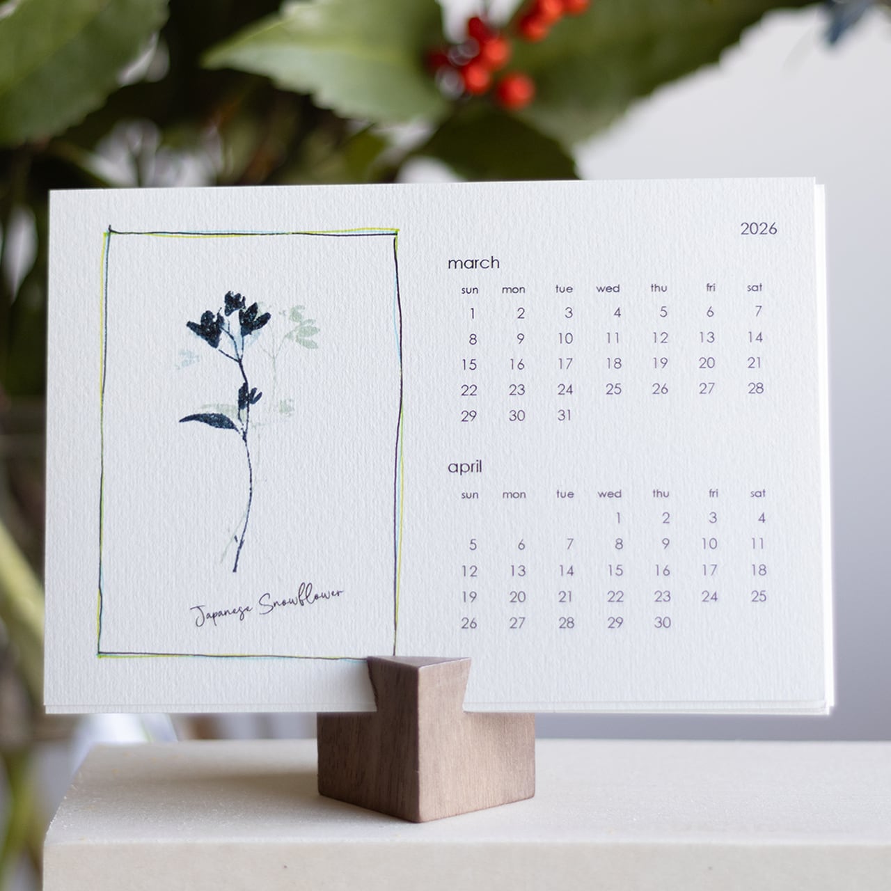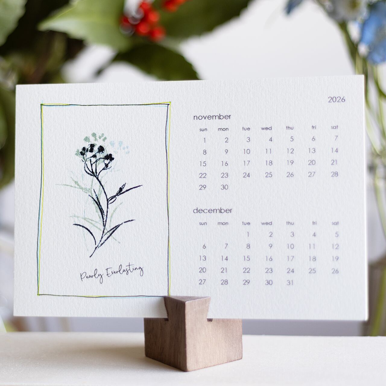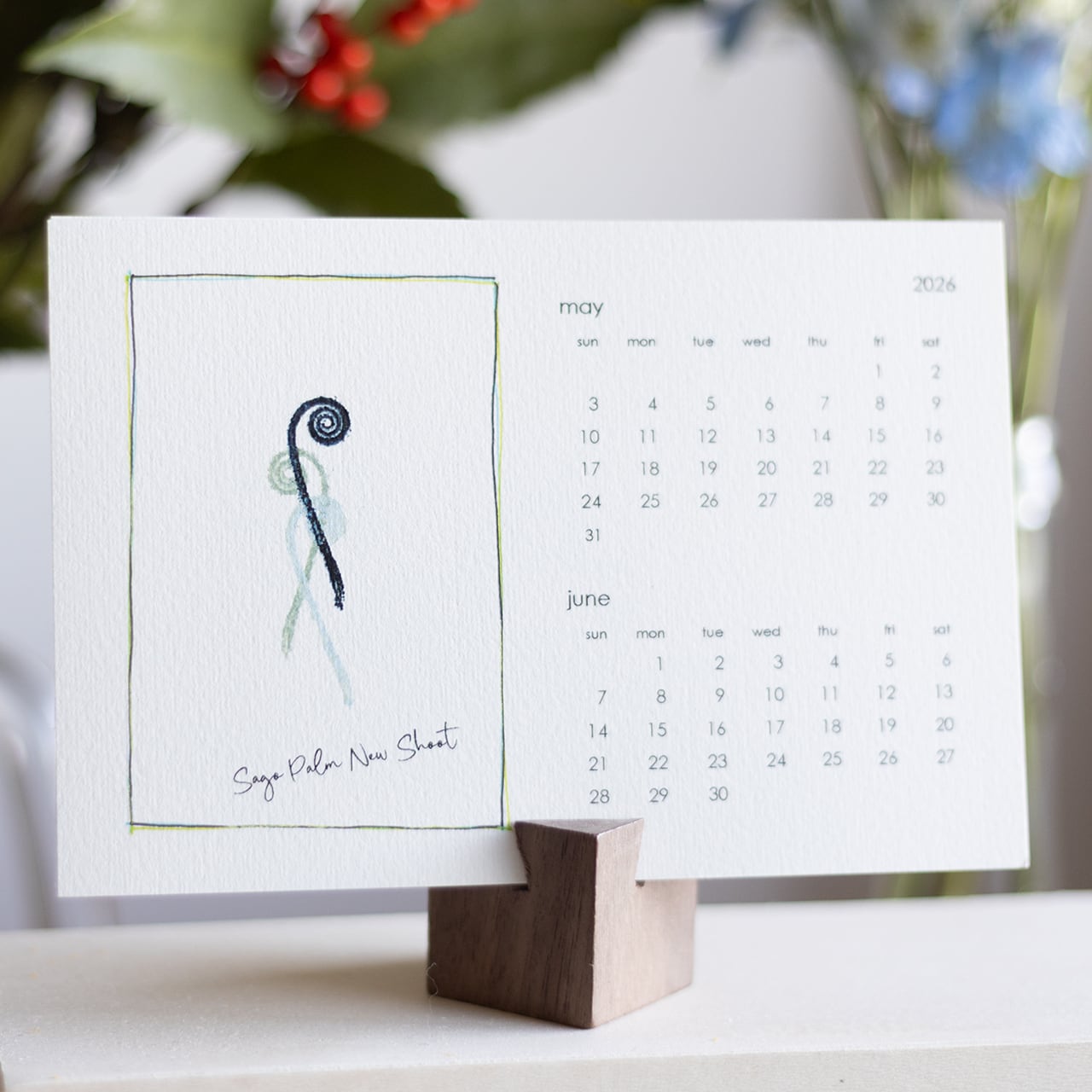 ボタニカルモノプリントのシンプルな2026年カレンダー。2ヶ月1枚、ポストカードサイズの小さめカレンダーです。