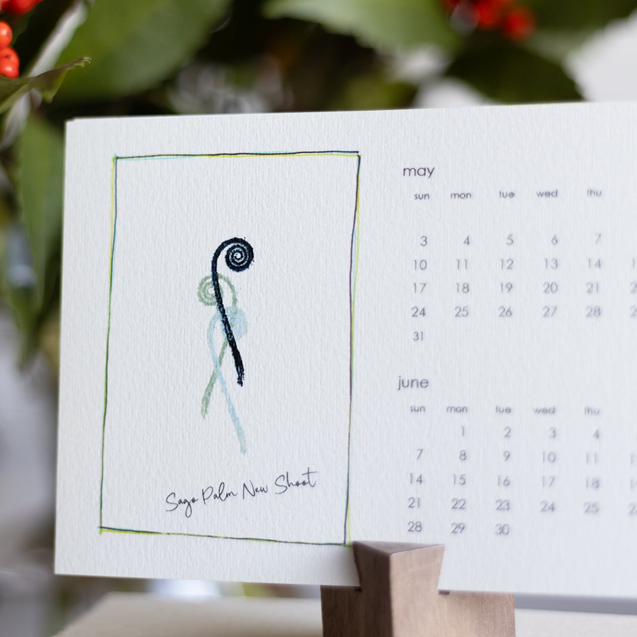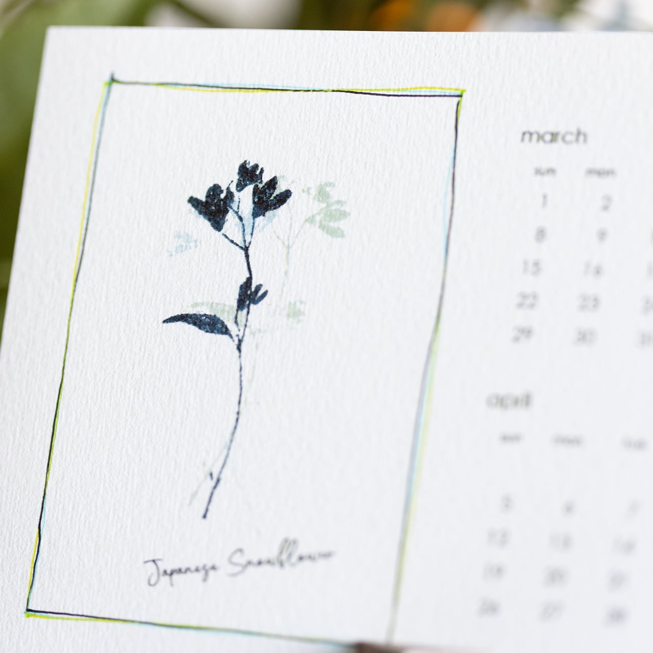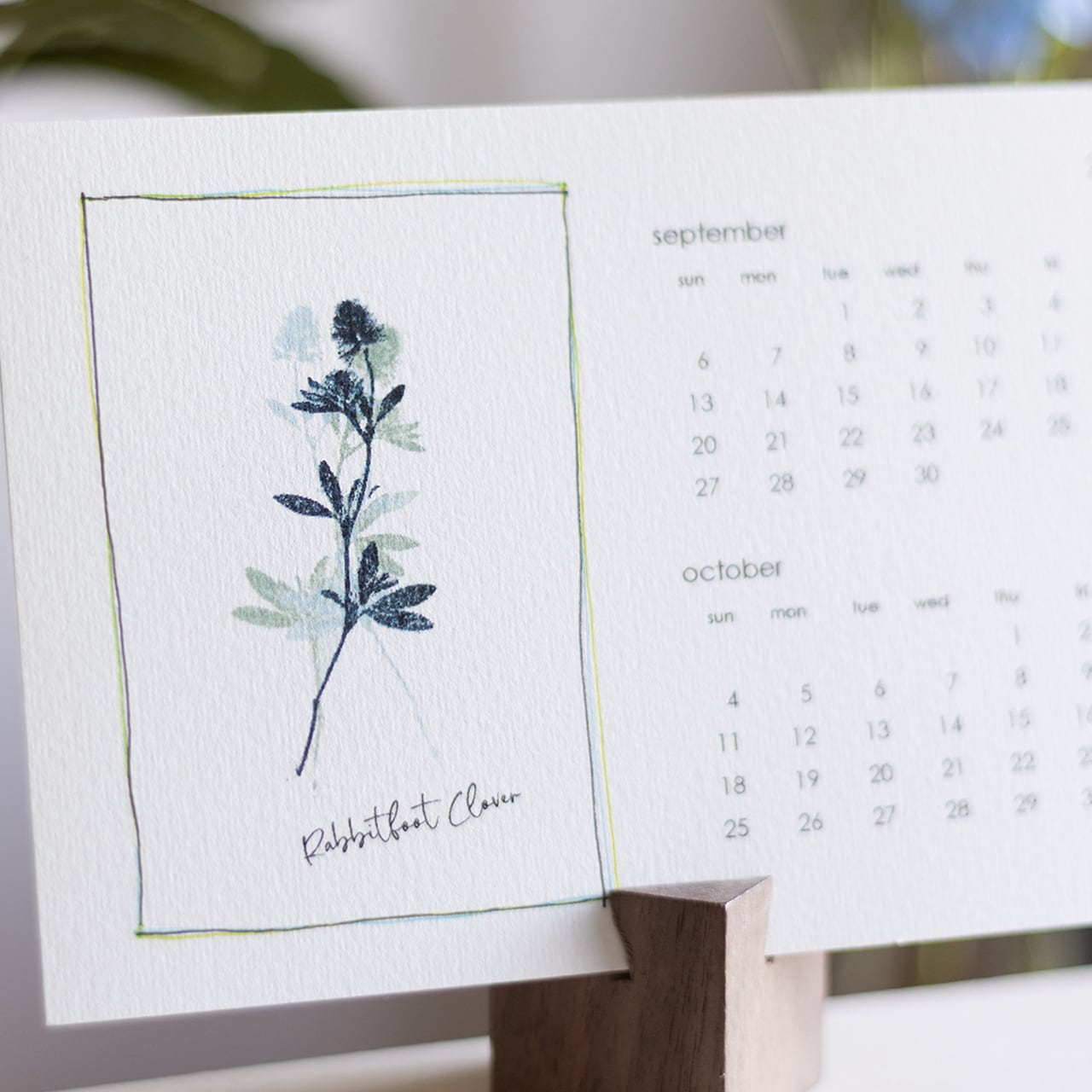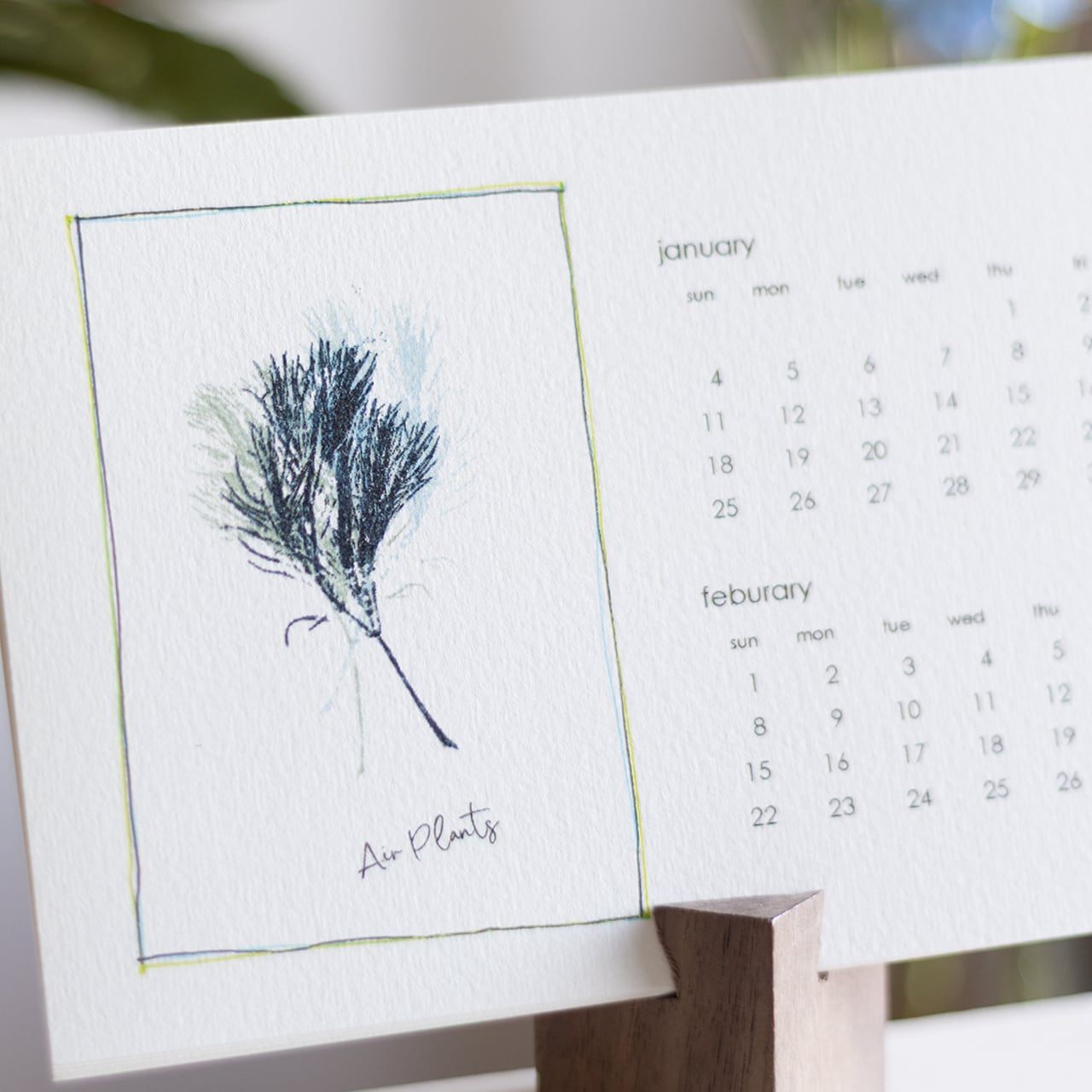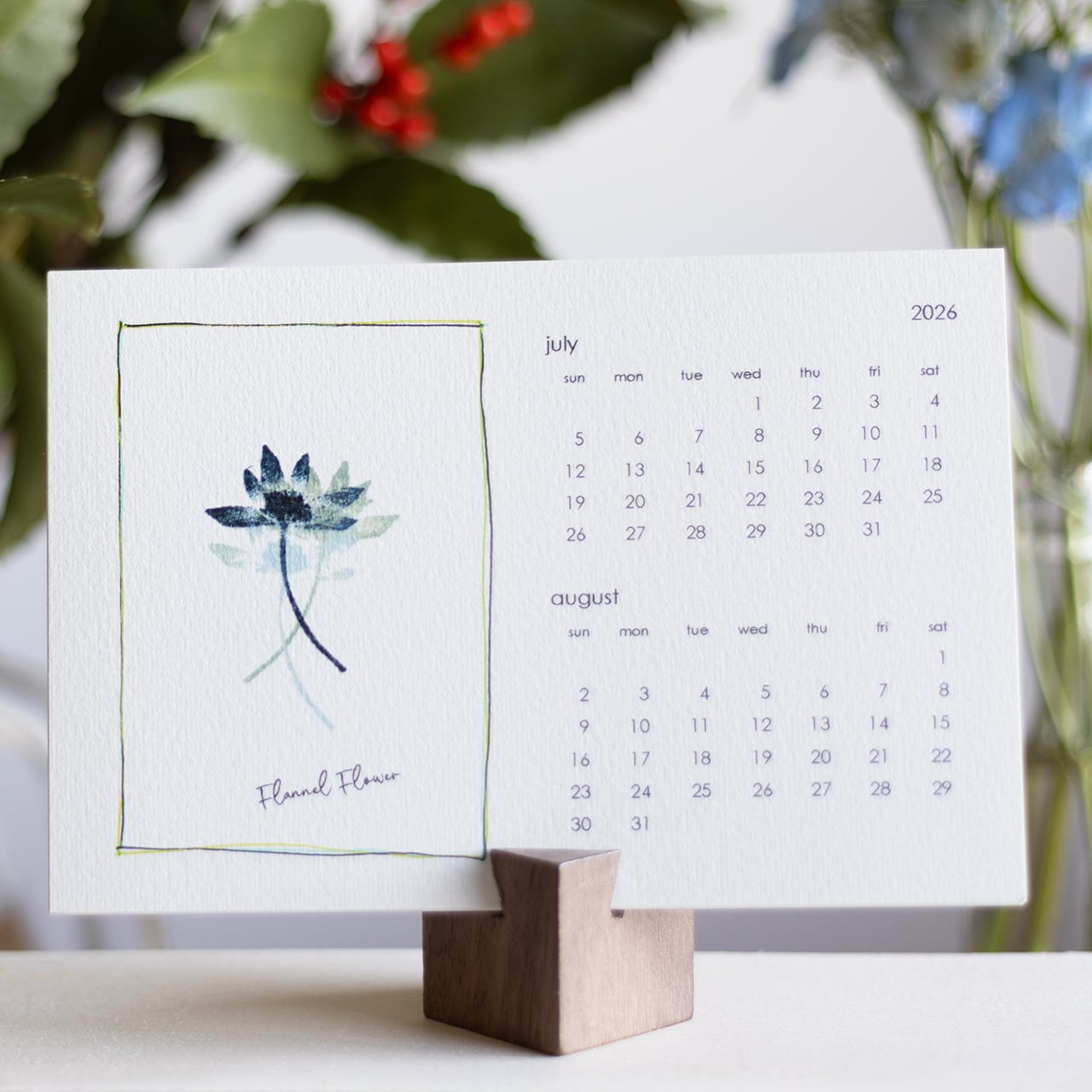 ボタニカルモノプリントのシンプルな2026年カレンダー。2ヶ月1枚、ポストカードサイズの小さめカレンダーです。