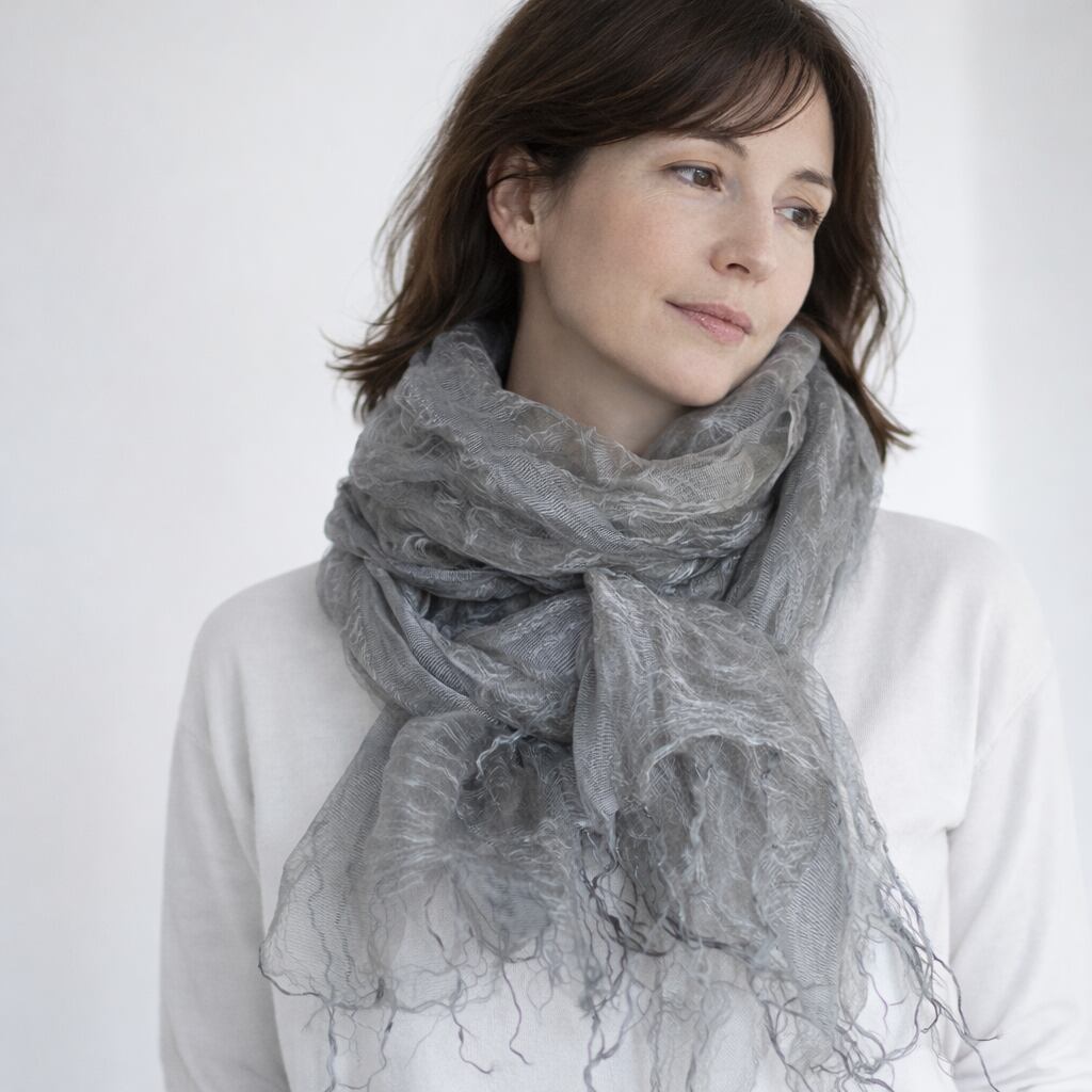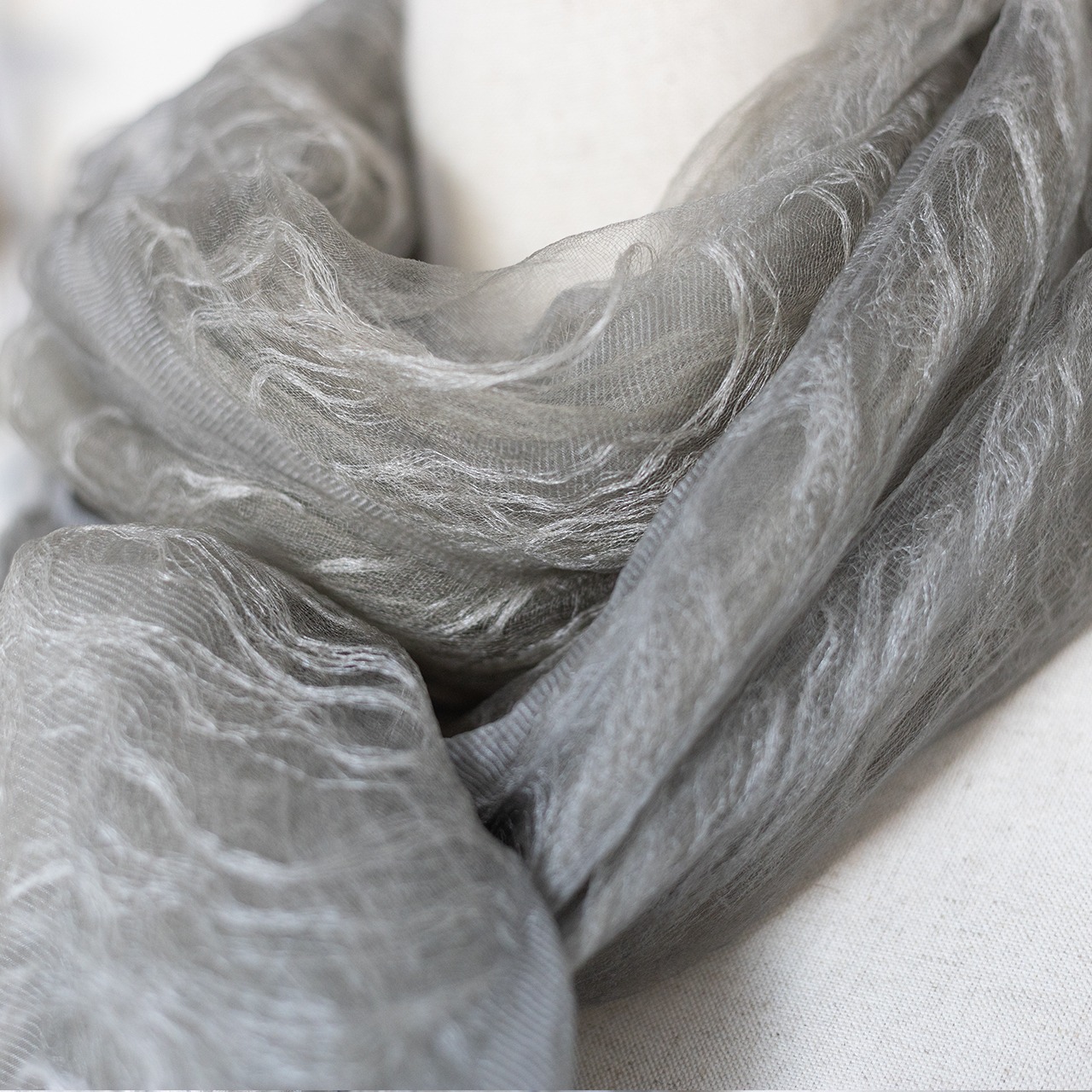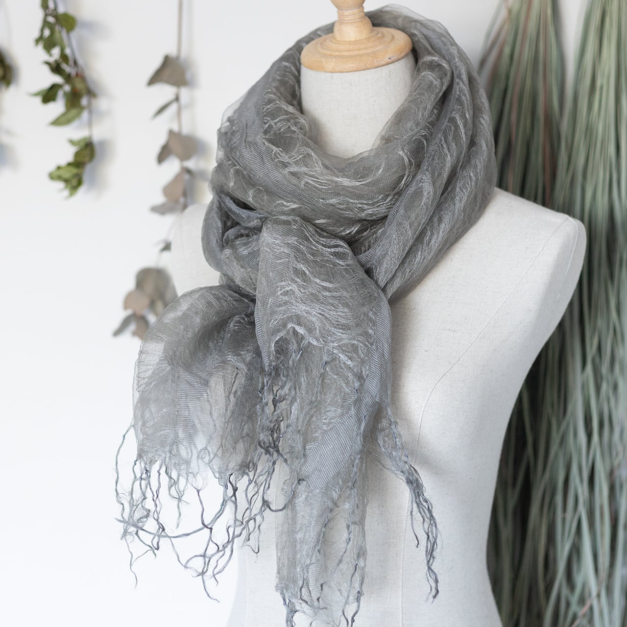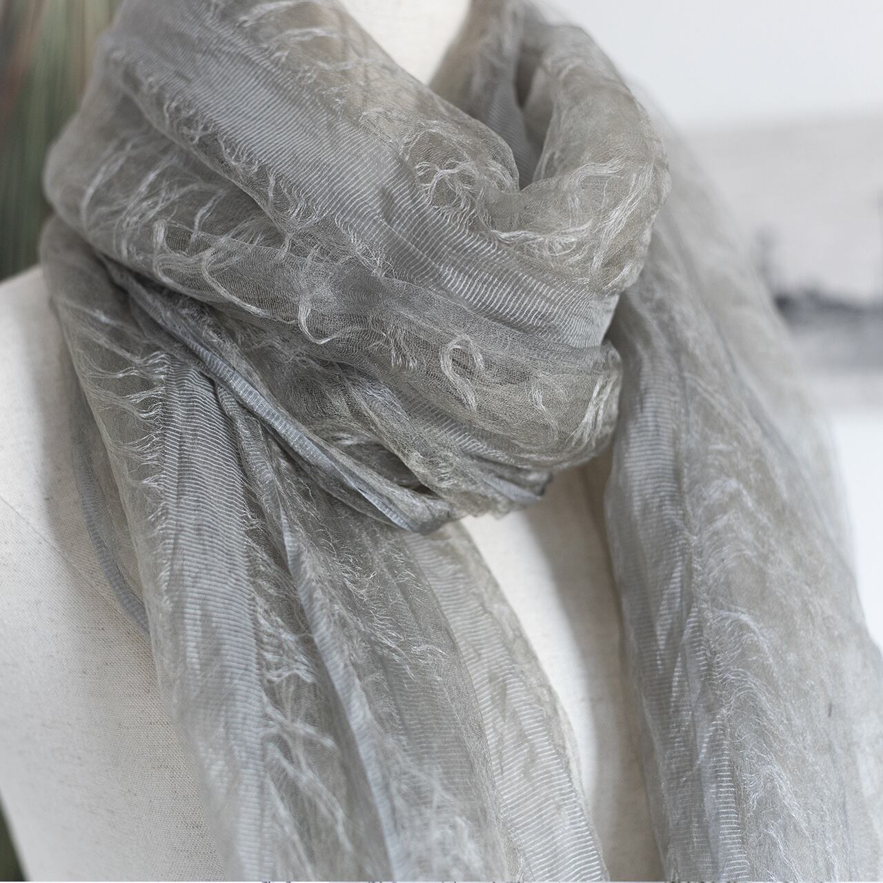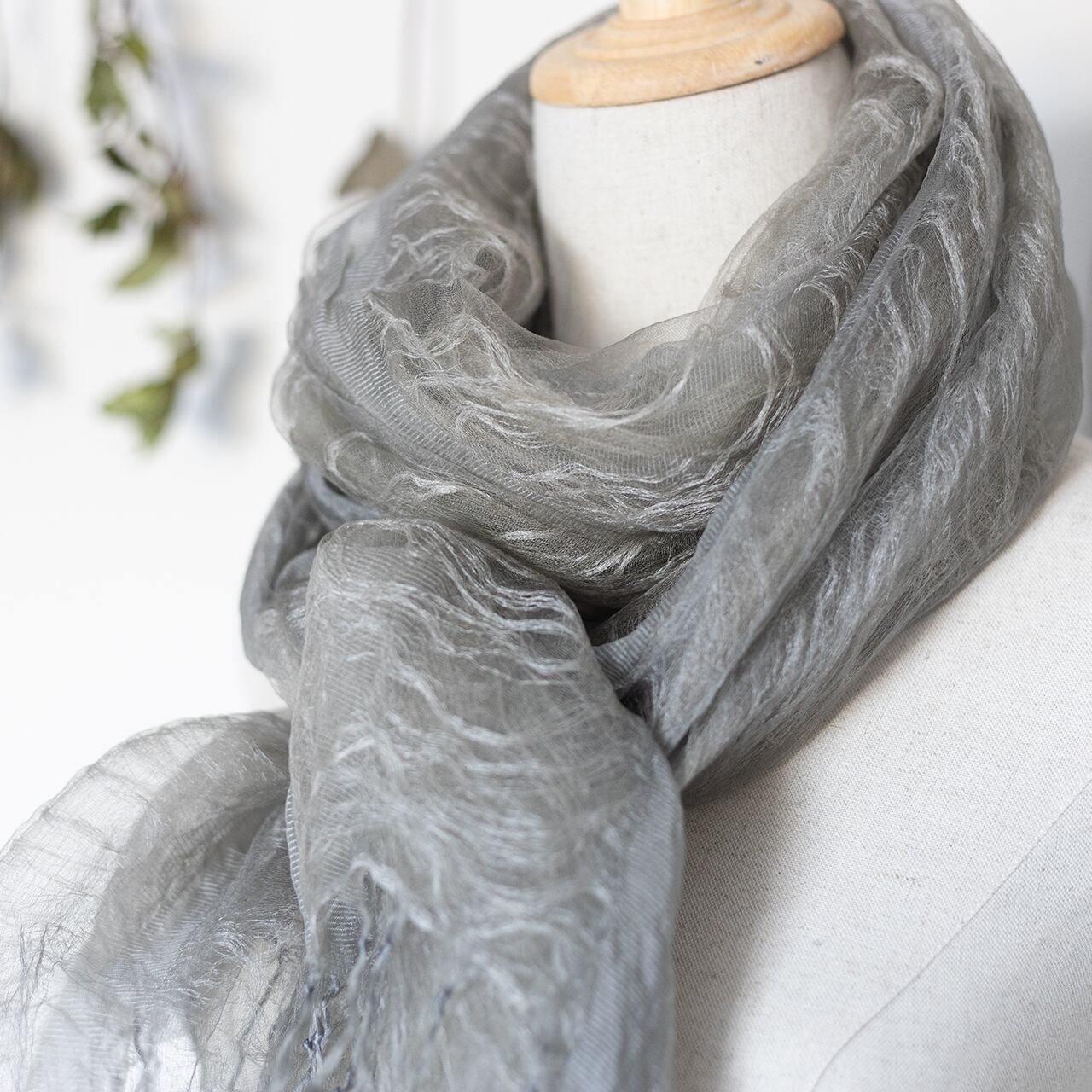 ログウッドで、やわらかなウォームグレーに染め上げたシルクストールです。