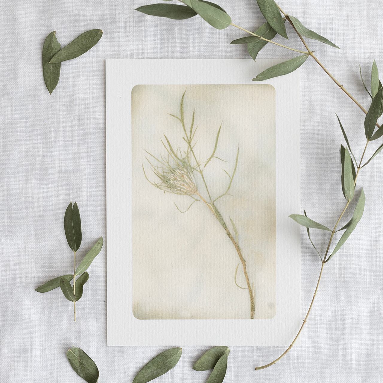 ハンドメイドポストカード。蜜蝋画(encaustic)に押し花を埋め込んだ、ビーズワックスコラージュの複製カード。